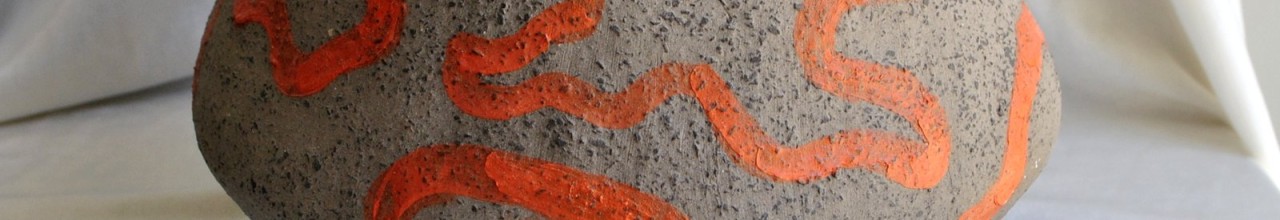Κεραμική γλάστρα-κασπώ με πορτοκαλί σχέδια. Ιδιαίτερος γκρι πηλός με μεγάλους μαύρους κόκκους.